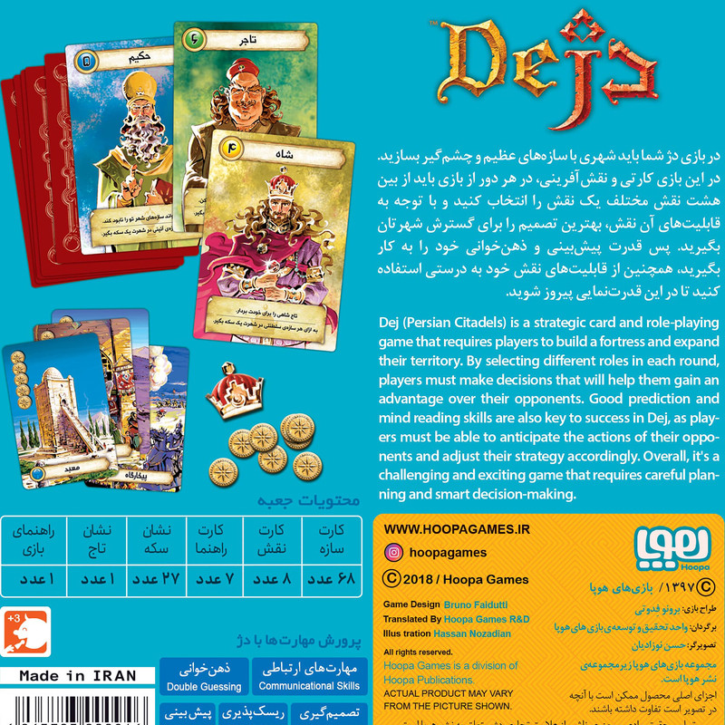 بازی دژ بر اساس یکی از محبوبترین و پرطرفدارترین بازیهای کارتی مدرن به نام Citadels ساخته شده. این بازی ترکیب ظریفی است از سبک بازی های نقش مخفی و شهرسازی. اولین بار Bruno Faidutti ، طراح باسابقهی بازیهای رومیزی، در سال 2000 این بازی را طراحی و تولید کرد. این بازی از همان ابتدا با استقبال زیادی در سراسر دنیا روبهرو شد. استقبال بیسابقه از این بازی باعث شد ناشران بینالمللی بارها آن را بازتولید کنند این بازی در طول 15 سال به 25 زبان ترجمه شد. انتشارات هوپا در سال 1395 و با خرید حق تالیف Citadels از ناشران و مولفان این بازی و پس از باز طراحی آن به کمک تیم طراحی خود این بازی را با نام دژ منتشر و راهی بازار کرد.