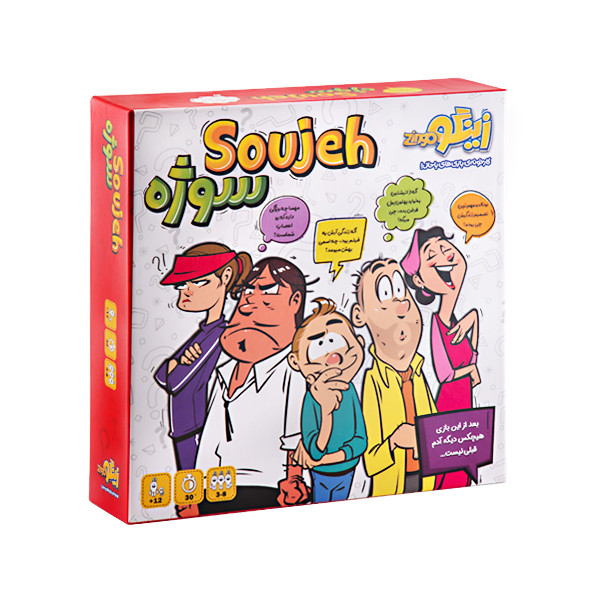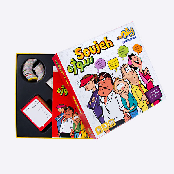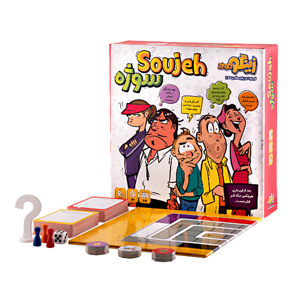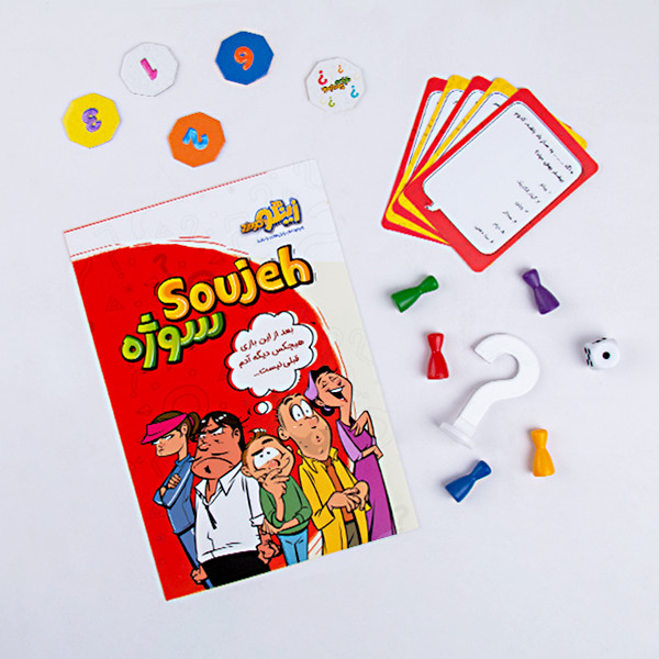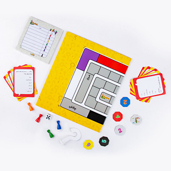 | اقلام همراه | صفحه بازی100 عدد کارت سوالتوکن رای در 8 رنگتاس8 مهره در 8 رنگمهره ی سوژهدفترچهبروشور بازی |