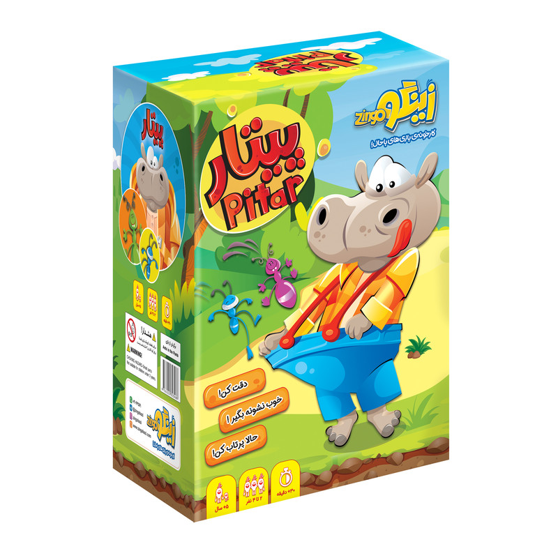 | سایر توضیحات | این بازی حداقل 20 دقیقه طول میکشه، حالا یه ذره ممکنه بالا و پایین بشه!اما چیزی که مهمه اینه که انقدر خوش میگذره که تو اصلا گذشت زمان رو حس نمیکنی.مورچهها رو میذاریم جلومون و شلوار اسب آبی رو نشونه میگیریم. برای یه پرتاب خفن کافیه دم مورچه رو به سمت پایین فشار بدین و یه باره رها کنید.هدف بازی اینه که مورچهها یه راست بپرن توی شلوار اسب آبی و شکار بشن!برندهی بازی پیتار کیه؟اولین بازیکنی که هر 4 تا مورچهش رو بندازه داخل شلوار اسب آبی مقوایی، برندهی بازیه! |