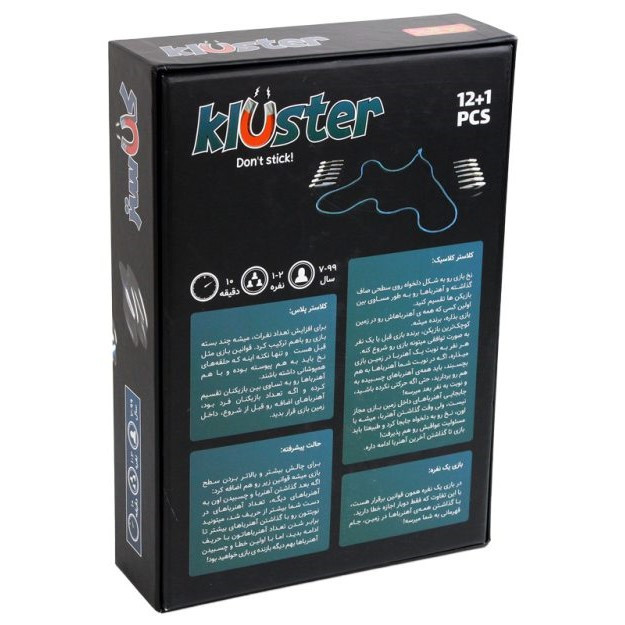 | خلاصه روش بازی | کلاستر کلاسیک :نخ بازی رو به شکل دلخواه روی سطحی صاف گذاشته و آهنرباها رو به طور مساوی بین بازیکن ها تقسیم کنید.اولین کسی که همه ی آهنرباهاش رو در زمین بازی بذاره برنده میشه.کوچک ترین بازیکن، برنده بازی قبل با یک نفر به صورت توافقی میتونه بازی رو شروع کنه. هر نفر به نوبت یک آهنربا در زمین بازی میذاره اگه در نوبت شما آهنرباها به هم بچسبند باید همه ی آهنرباهای چسبیده به هم رو بردارید حتی اگه حرکتی نکرده باشید، و نوبت به نفر بعد میرسه جابجایی آهنرباهای داخل زمین بازی مجاز نیست ولی وقت گذاشتن آهنربا، میشه با اون، نخ رو به دلخواه جابج کرد و طبیعتا باید مسئولیت عواقبش رو هم پذیرفت بازی تا گذاشتن آخرین آهنربا ادامه داره.بازی یک نفرهدر بازی یک نفره همون قوانین برقرار هست با این تفاوت که فقط دوبار اجازه خطا دارید. با گذاشتن همهی آهنرباها در زمین، جام قهرمانی به شما میرسه.کلاستر پلاسبرای افزایش تعداد نفرات میشه چند بسته بازی رو باهم ترکیب کرد قوانین بازی مثل قبل هست و تنها نکته اینه که حلقه های نخ باید به هم پیوسته بوده و همپوشانی داشته باشند. آهنرباها رو به تساوی بین بازیکنان تقسیم کرده و اگه تعداد بازیکنان فرد بود، آهنرباهای اضافه رو قبل از شروع داخل زمین بازی قرار بدید.حالت پیشرفتهبرای چالش بیشتر و بالاتر بردن سطح بازی میشه قوانین زیر رو هم اضافه کرد :اگه بعد گذاشتن آهنربا و چسبیدن اون به آهنرباهای دیگه تعداد آهنرباهای در دست شما بیشتر از حریف شد میتونید نوبتتون رو با گذاشتن آهنرباهای بیشتر تا برابر شدن تعداد آهنرباهاتون با حریف ادامه بدید اما با اولین خطا و چسبیدن آهنرباها بهم دیگه بازنده ی بازی خواهید بود. |