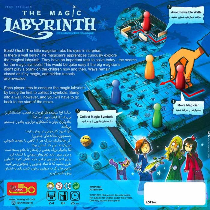 | خلاصه روش بازی | نگ! آخ! شعبده باز کوچک با تعجب چشمانش را میمالد: اِ؟ اینجا دیوار است؟! جادوگران جوان با کنجکاوی هزارتوی جادو را جستجو میکنند. آنها امروز کار مهمی در پیش دارند: جستجوی نشانههای جادویی! اگر جادوگران بزرگ هر از گاهی با بچهها شوخی نمیکردند، این کار آسانی بود! امّا جادوگر بزرگ بعضی از راه ها را با جادو بسته است و برای عبور، باید تونلهای پنهانی را کشف کرد. برای فتح هزارتوی جادو، باید تلاش کنید تا اولین نفری باشید که 5 نماد جادویی را جمعآوری میکنید. با این حال اگر به دیواری برخورد کنید، باید به ابتدای پیچ و خم برگردید. |